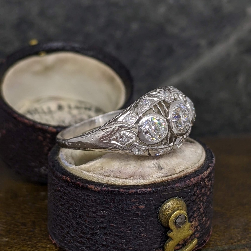This ring features three primary old cut diamonds bezel set in platinum, with stunning open work detail between each diamond. The ring has a curved shape which sits slightly off the finger and is set with small diamonds at the sides, giving a beautiful sparkle at every angle and a total carat weight of 0.9cts. The sides and shoulders of this ring have beautifully ornate detail, a wonderful addition to any jewellery lovers collection!