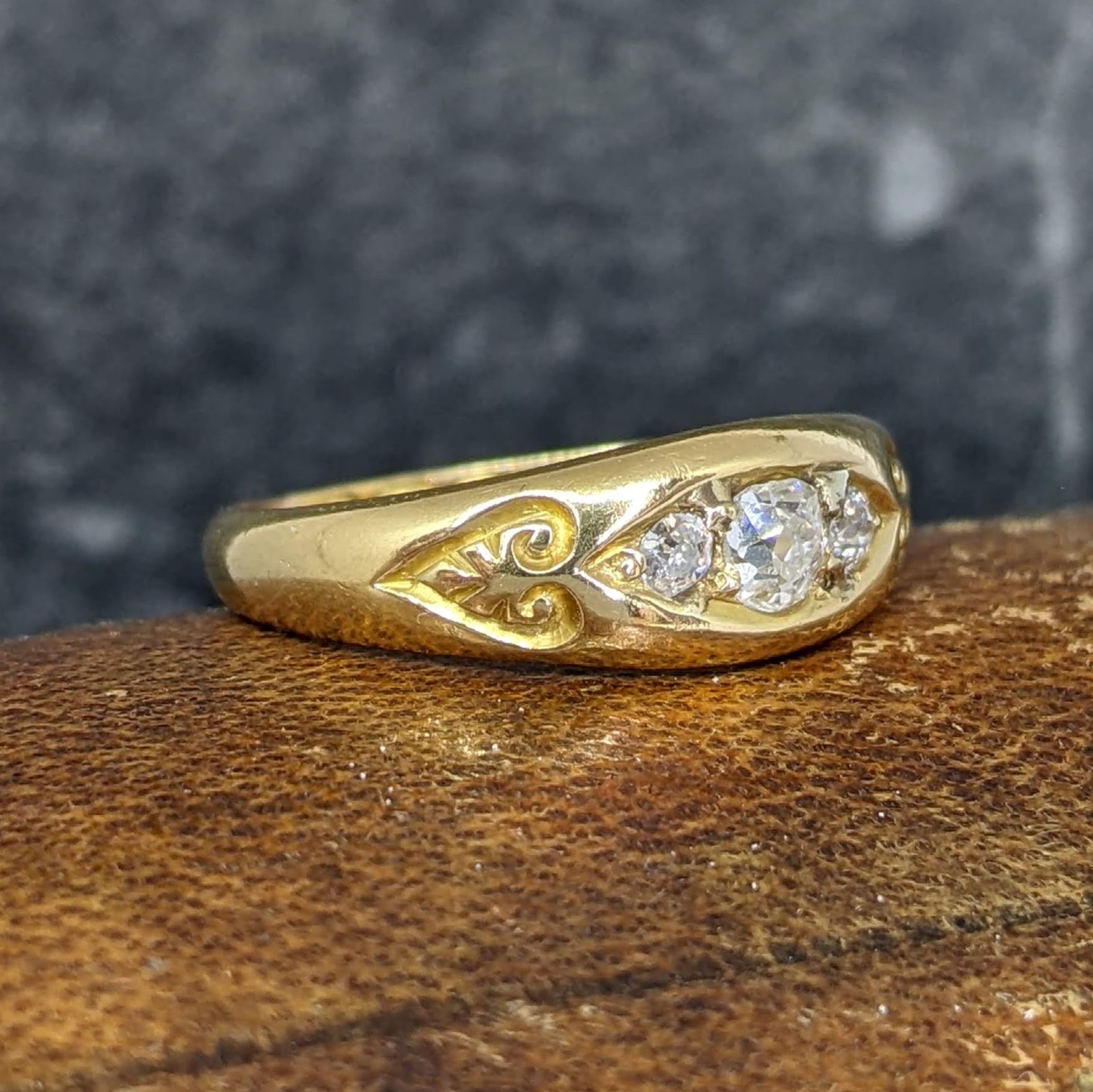 This ring features three old cut diamonds to the centre, with a heart shape and pretty swirling detail to each shoulder. The ring has a combined diamond carat weight of 0.30cts. This is a lovely and unique design with nice width on the hand – perfect for stacking or wearing by itself.