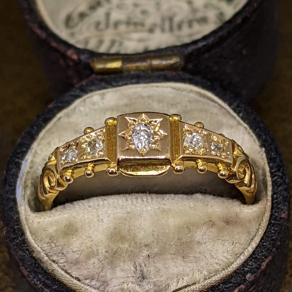 An antique five stone diamond ring in 18k gold.