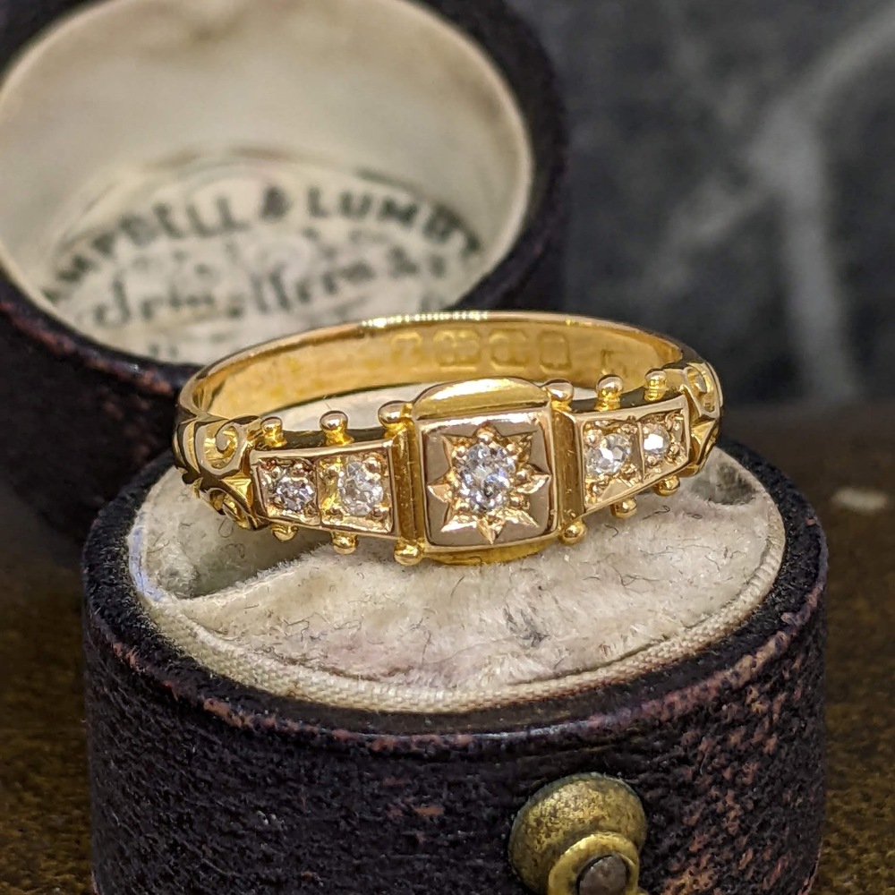 This ring features five old mine cut diamonds, graduated in size towards the centre of the ring. The largest central stone is surrounded by a pretty star pattern with swirling details to the shoulders.