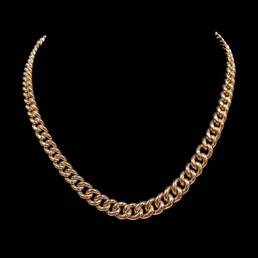 This necklace has a classic solid curb link, which is heavily graduated towards the centre and looks very substantial while wearing. This piece has nice weight to it at 50.1 grams and measuring approximately 15.5″, which is on the shorter side. The link tapers significantly towards the back, closing with a swivel clasp for a nice secure closure.