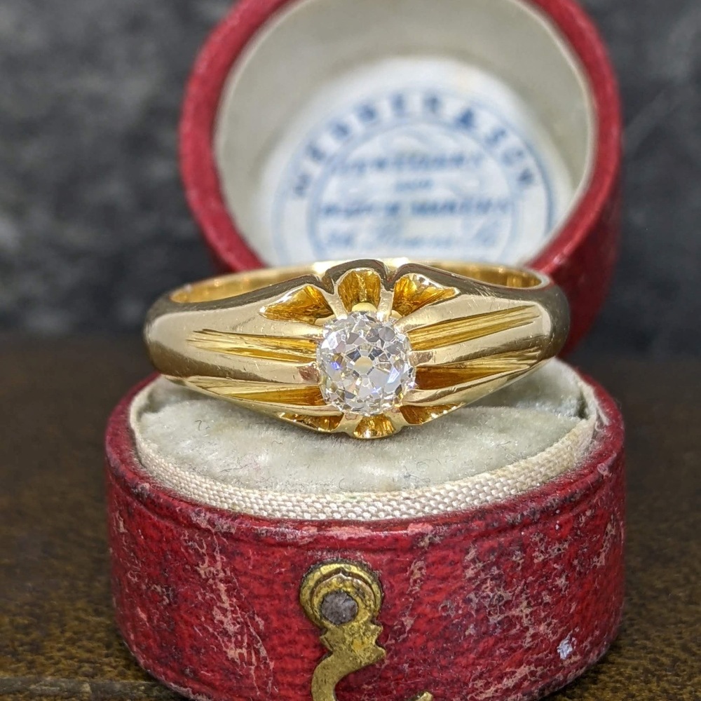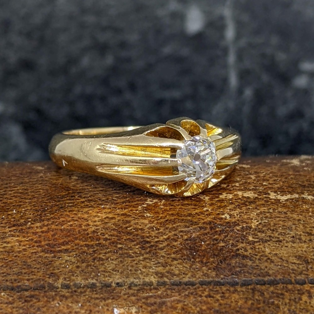 This ring features a central Old Mine Cut diamond with a stunning sparkle, secured in a ten claw setting. This ring has a nice chunky band, with a silky and luxurious feeling to the rich yellow gold. The shoulders of the band have linear details which flow into the claws and give great shape to this ring on the hand. The old cut diamond has a total carat weight of 0.7cts, and it is beautifully bright!