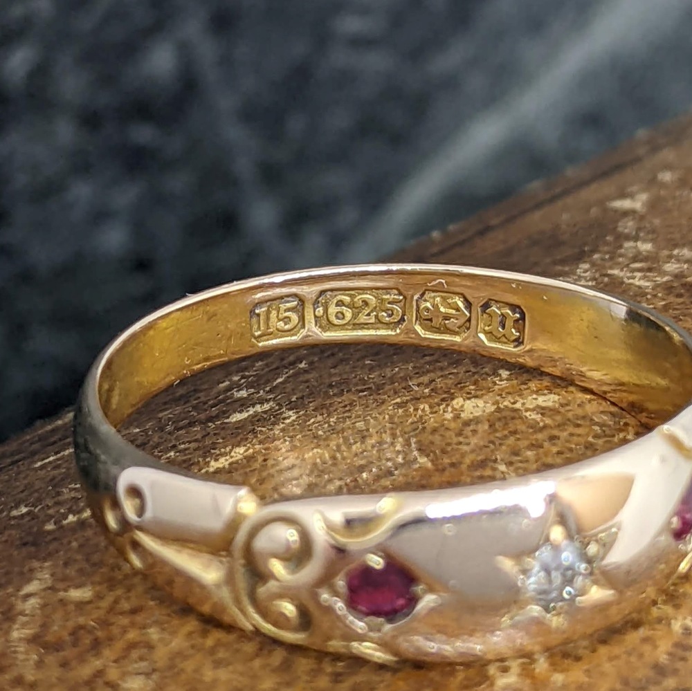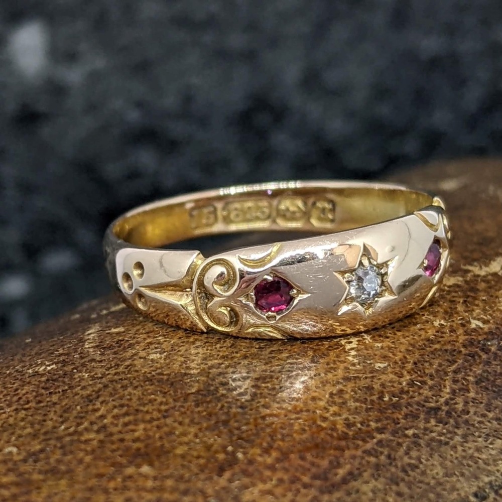 This ring features a central bright diamond, surrounded by a star pattern to the outside. The diamond is flanked at each side by a vibrant ruby secured in a little box setting. The shoulders of the band have a very pretty swirling and dotted design, which catch the light very well. The ring has a nice rosy tone and sits close to the finger – very comfortable and easy to wear. This piece is a true antique treasure with crisp Birmingham hallmarks for 1894, making this ring 132 years old.
