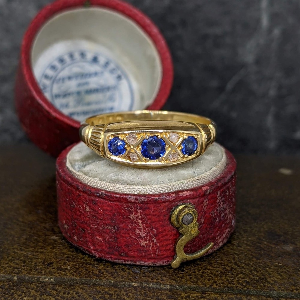 This ring features three round cut sapphires, each with two diamonds set between. The sapphires graduate slightly towards the centre, and give lovely colour and contrast to this piece. To each shoulder are linear patterns which taper at each side.