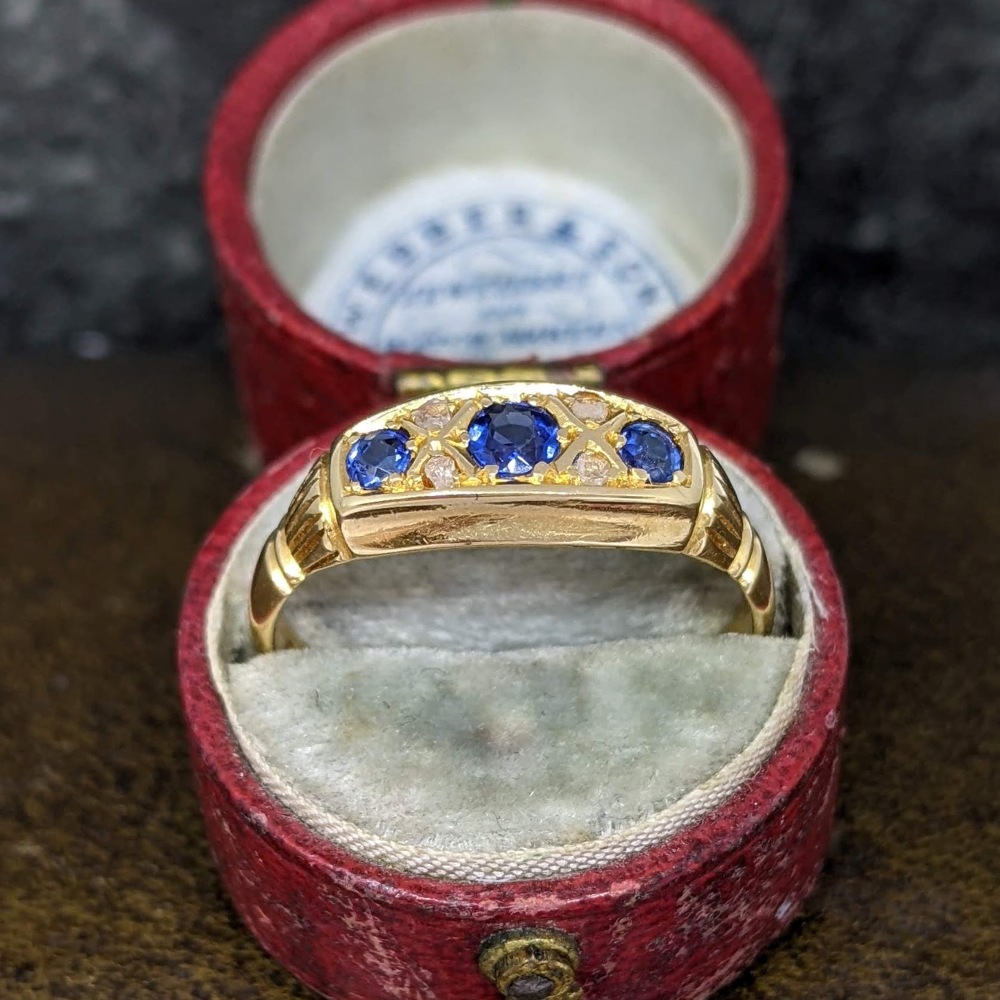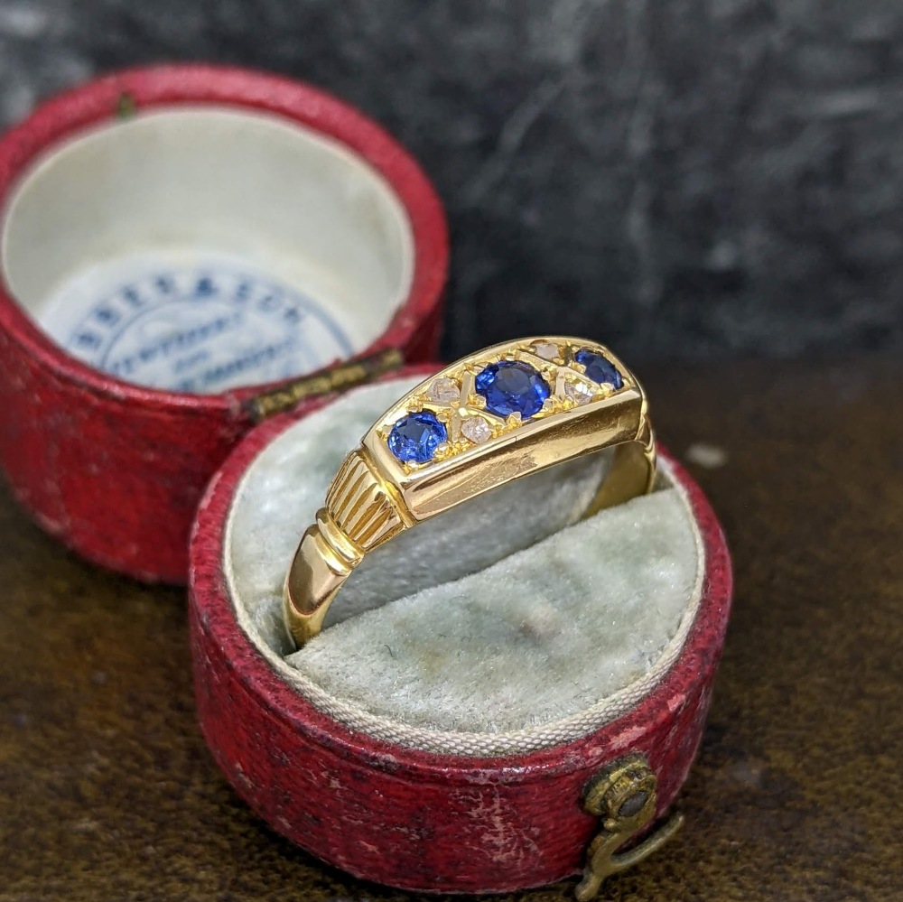 A pretty antique sapphire and diamond five stone ring in 18k gold.