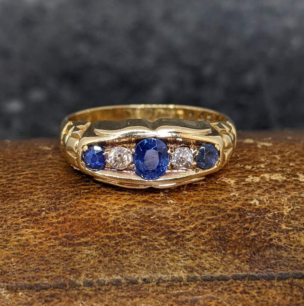 A pretty antique sapphire and diamond five stone ring in 18k gold.
