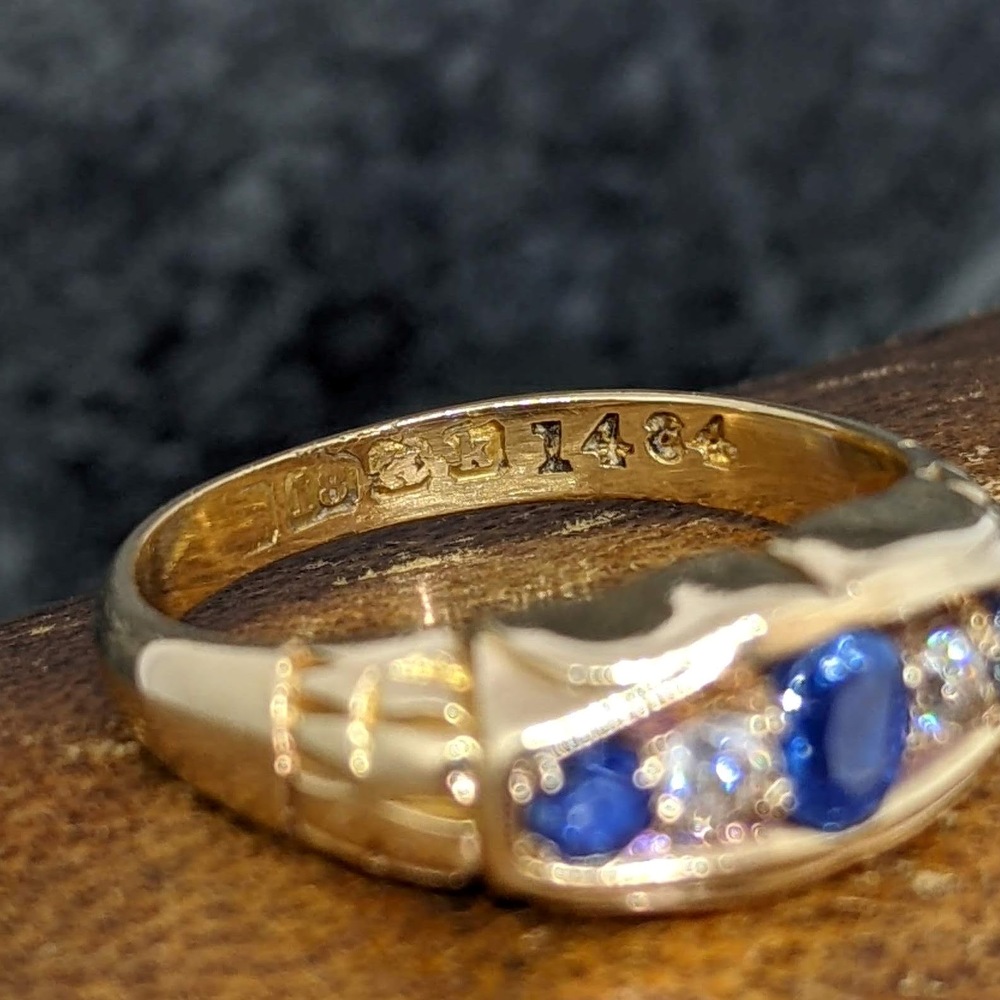 This ring features three sapphires slightly graduated in size, with a diamond set between. The sapphires have a lively blue colour and contrast very well against the bright diamonds and rich 18k yellow gold. To each shoulder are linear and swirling patterns to the shoulders. This is a neat ring on the hand, with crisp Birmingham hallmarks to the band dating this ring to 1909.