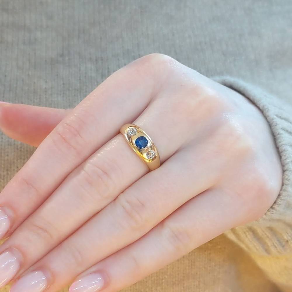 This ring features a central round cut sapphire with a deep blue colour, secured in a flush 18k gold setting. The sapphire weighs an estimated 0.5cts and is beautifully vibrant. The sapphire is flanked by an old cut diamond to each side weighing a combined 0.28cts, giving beautiful sparkle to this ring. The ring has a nice, chunky band with a substantial feel on the hand, and has clear hallmarks for Birmingham dating from 1914.
