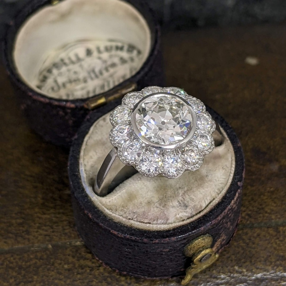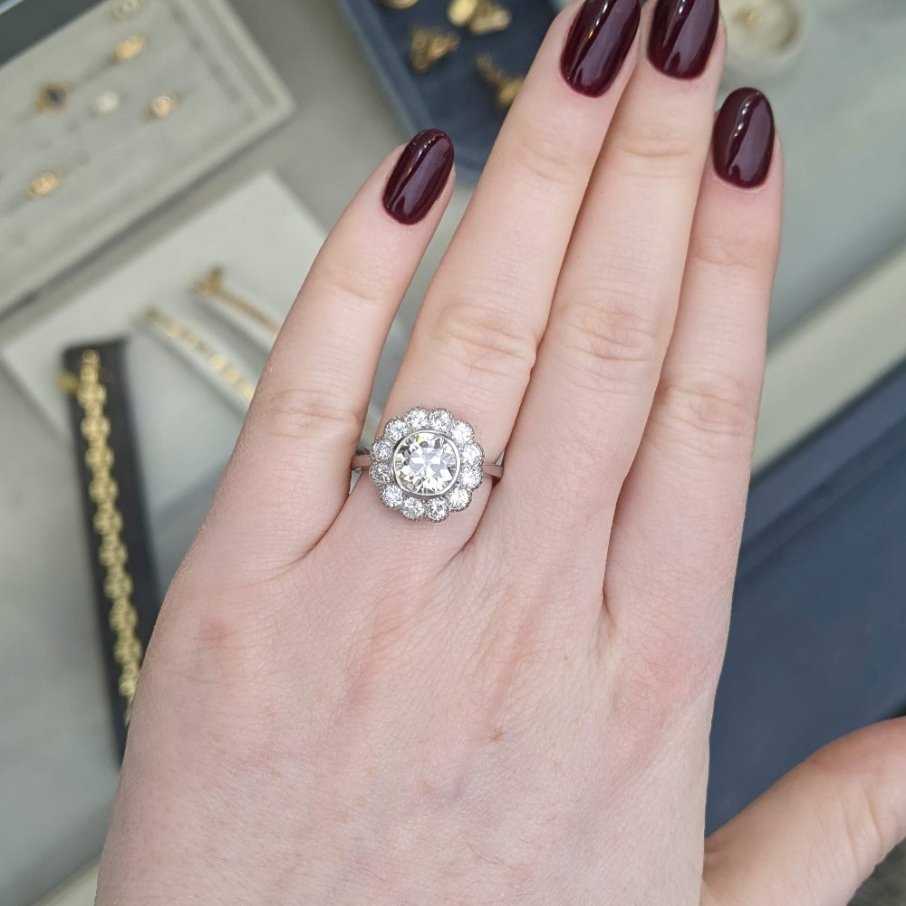 This ring features a large Old European cut diamond to the centre, secured in a platinum bezel setting. The central diamond is a very impressive 1.7cts, with the beautiful glitter of an old hand cut stone. To the outside are twelve round brilliant cut diamonds in a cluster setting, giving nice shape to this ring on the hand. This is a large and impressive ring, very comfortable while wearing due to the smooth bezel settings – a beautifully bright example of the timeless cluster.