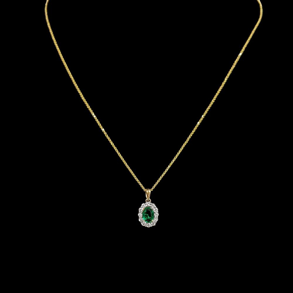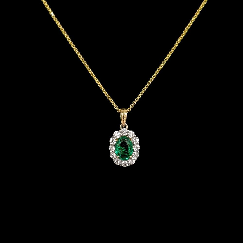 This pendant features an oval cut emerald with a vibrant green colour, claw set in yellow gold. The emerald is sizable and eye-catching with a carat weight of 0.76cts. To the outside are twelve round brilliant cut diamonds, adding beautiful sparkle and contrast in colour. The diamonds have a combined carat weight of 0.40cts, and the pendant sits on an 18k yellow gold chain which is adjustable in length between 16.5″ and 18″.