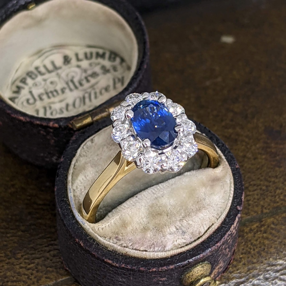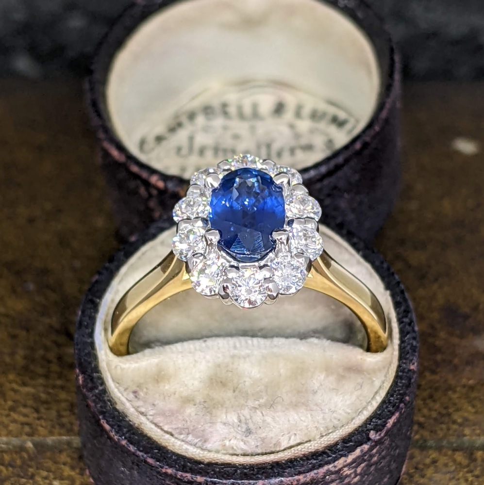 A classic sapphire and diamond cluster ring in 18k yellow gold and platinum