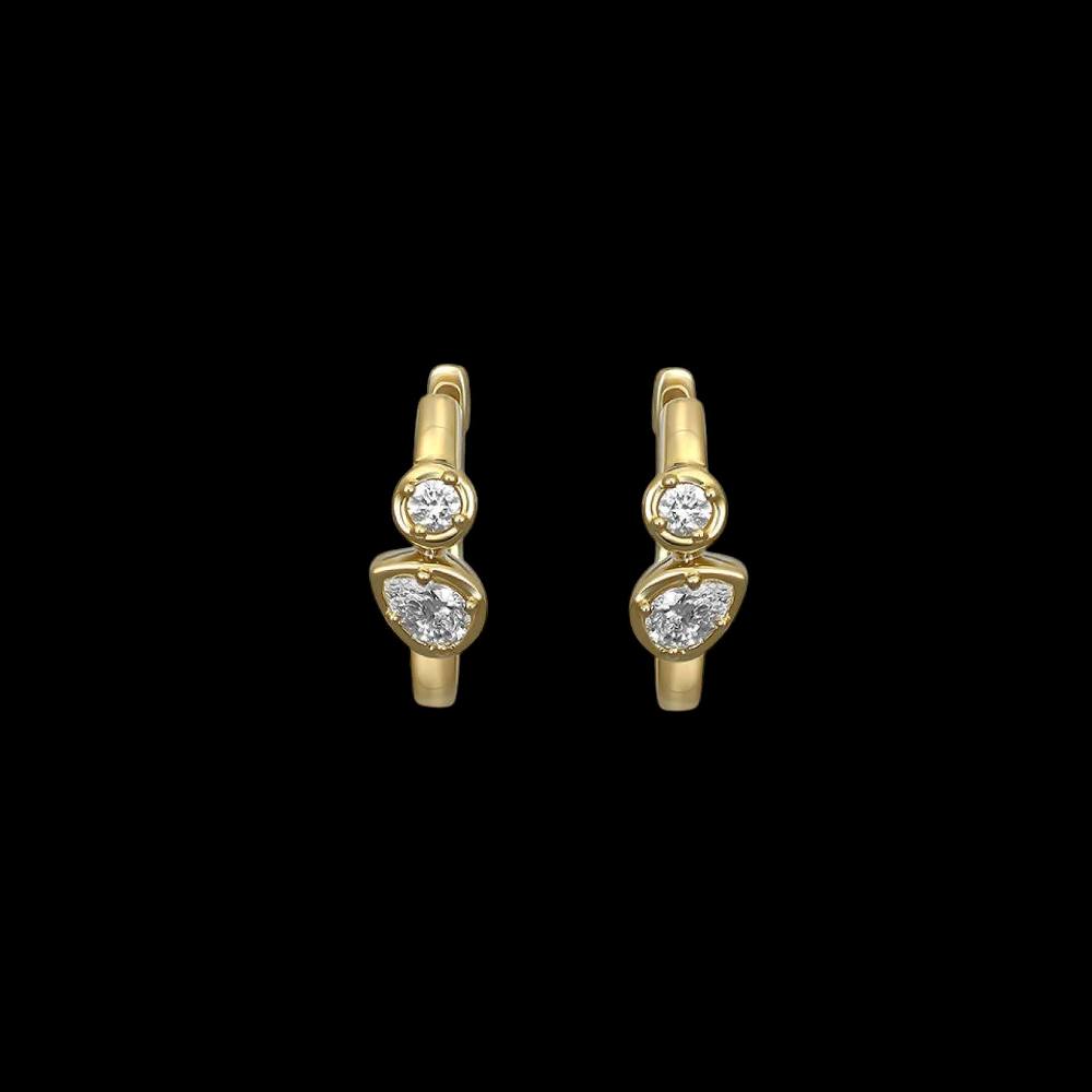These earrings are set with two beautiful diamonds, one round brilliant cut diamond with a pear cut diamond set below. The earrings have a hoop design, which allows the diamonds to drop below the ear to give nice movement while wearing. This design has a nice and secure closure, which is hinged at the back and feels comfortable on the ear.