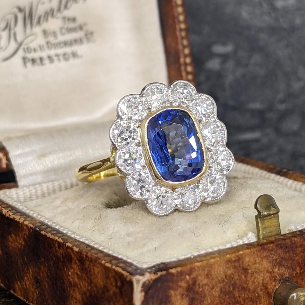 This ring features a beautiful elongated cushion cut sapphire to the centre, bezel set in yellow gold. The sapphire is 2.3 cts and is surrounded by 12 beautiful old cut diamonds with the stunning old world sparkle we love to see. The ring has a total diamond carat weight of 1.20cts, and the shoulders of the ring taper beautifully to an 18k yellow gold band.