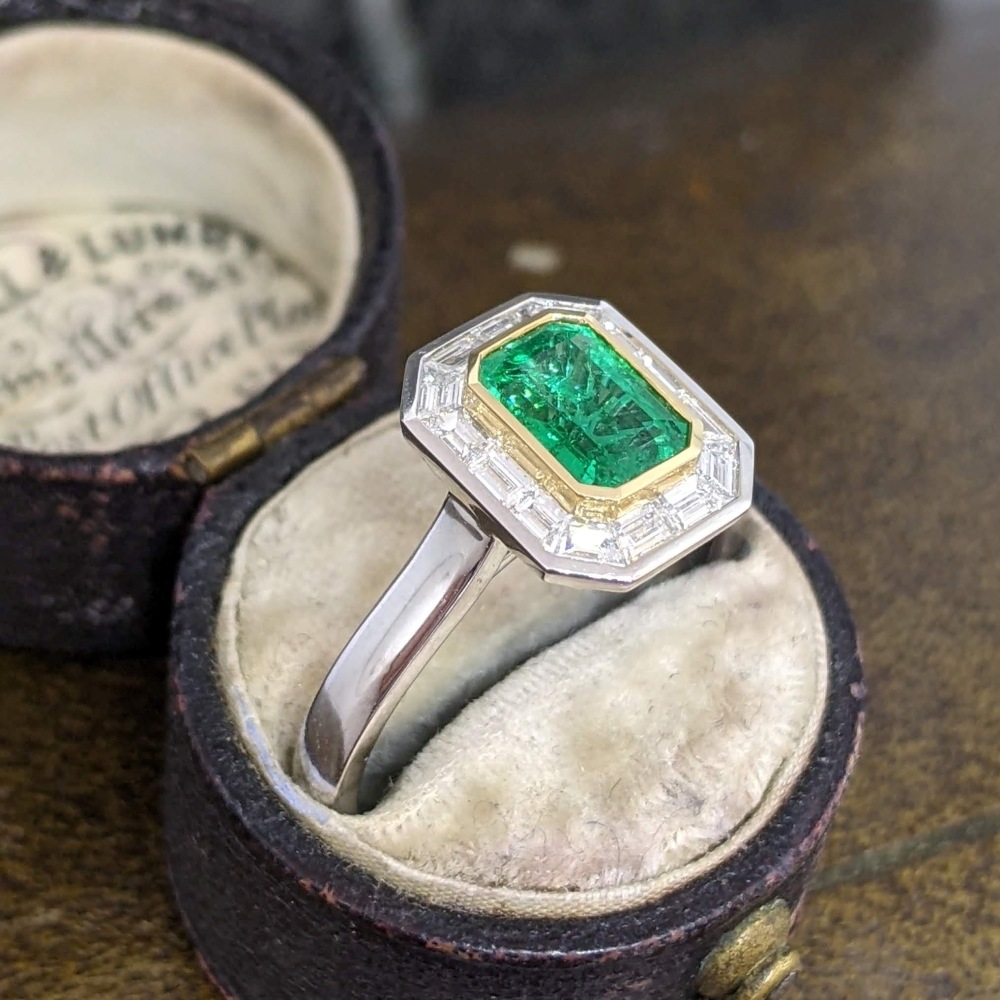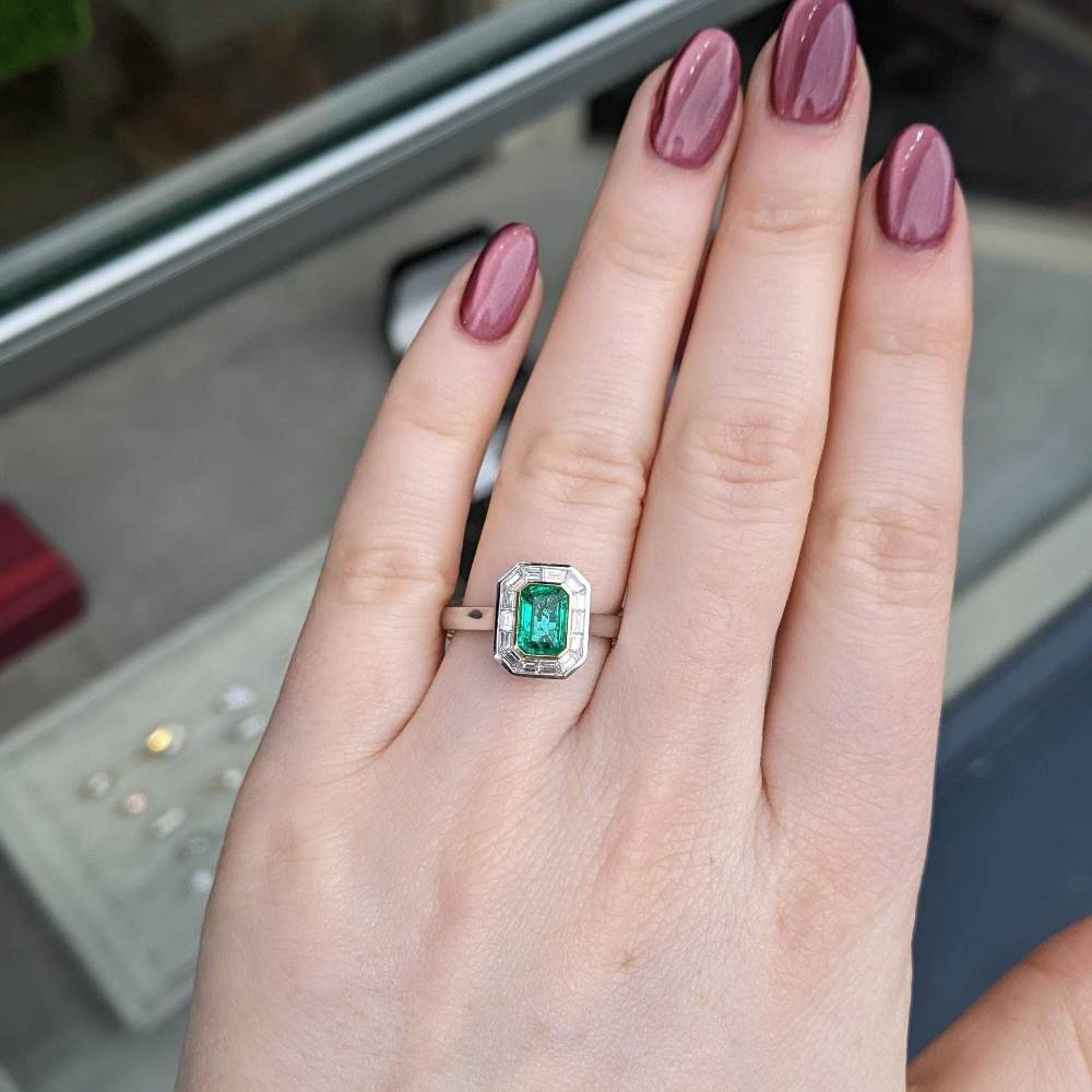 This ring features a central emerald cut emerald with stunning green colour – rich and lively with life throughout the stone. The emerald is 0.92cts and bezel set in 18k yellow gold giving nice contrast in colour to this ring. The emerald is surrounded by 14 baguette cut diamonds which are beautifully set for a sleek and elegant look, and a total diamond carat weight of 0.57cts.