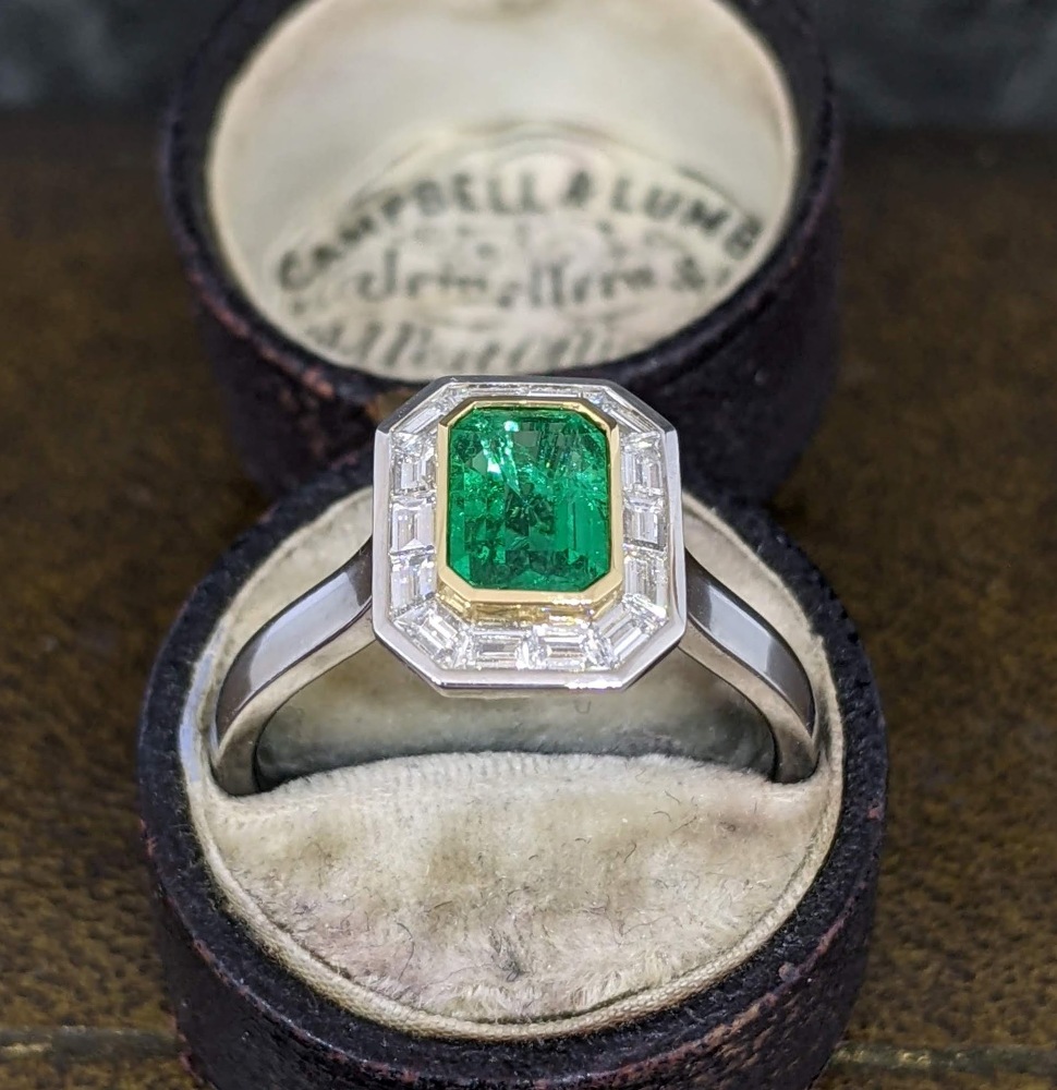 A stunning emerald and diamond ring set in 18k gold and platinum.