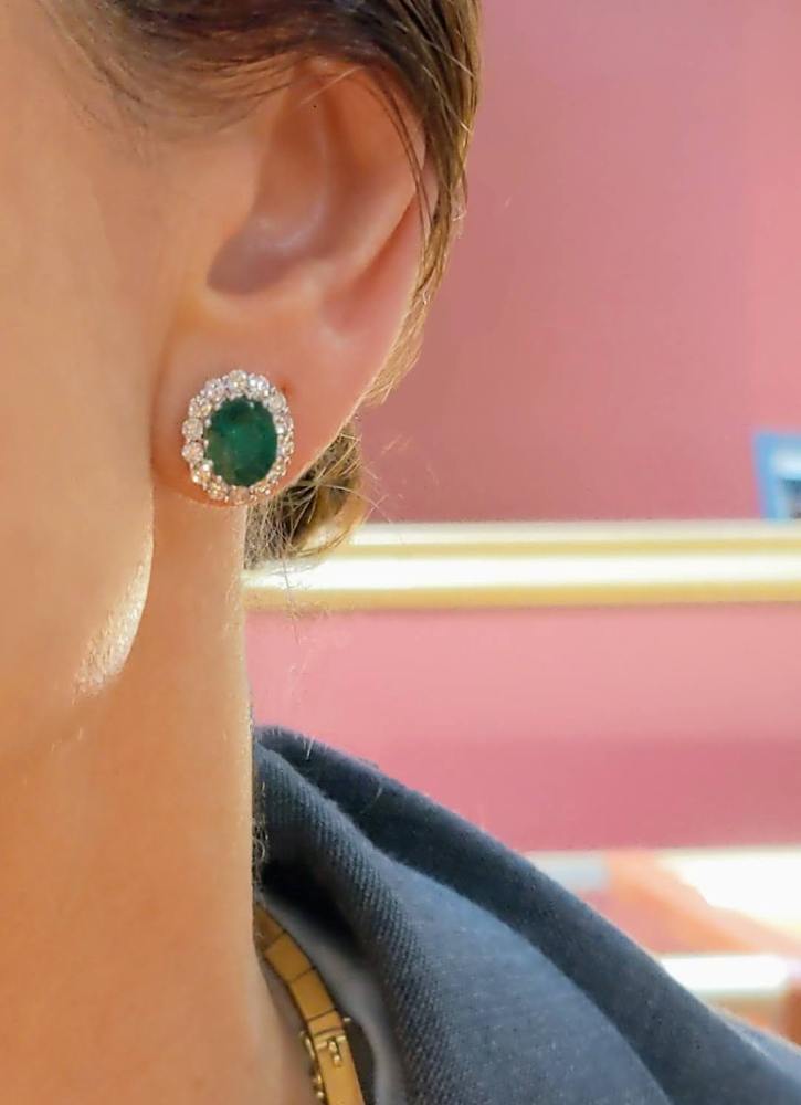 The earrings each feature large two oval cut emeralds with a rich green colour, claw set in 18k white gold. Each emerald weighs in excess of 2cts, with an impressive total emerald carat weight of 4.54cts. The emerald is surrounded by a row of bright round brilliant cut diamonds for a beautiful sparkle on the ear. These earrings are sizable on the ear – perfect for anyone searching for large clusters!