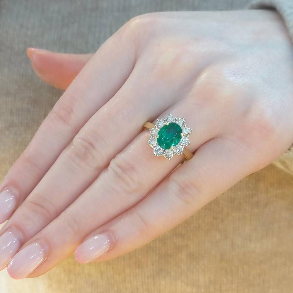 The oval emerald is a beautiful rich green colour , claw set in yellow gold with a carat weight of 1.50cts. The emerald is surrounded by ten bright diamonds, which contrast beautifully with the emerald with a total diamond carat weight of 1.20cts. This is a sizable ring on the hand, with beautifully bright diamonds – G colour SI clarity.