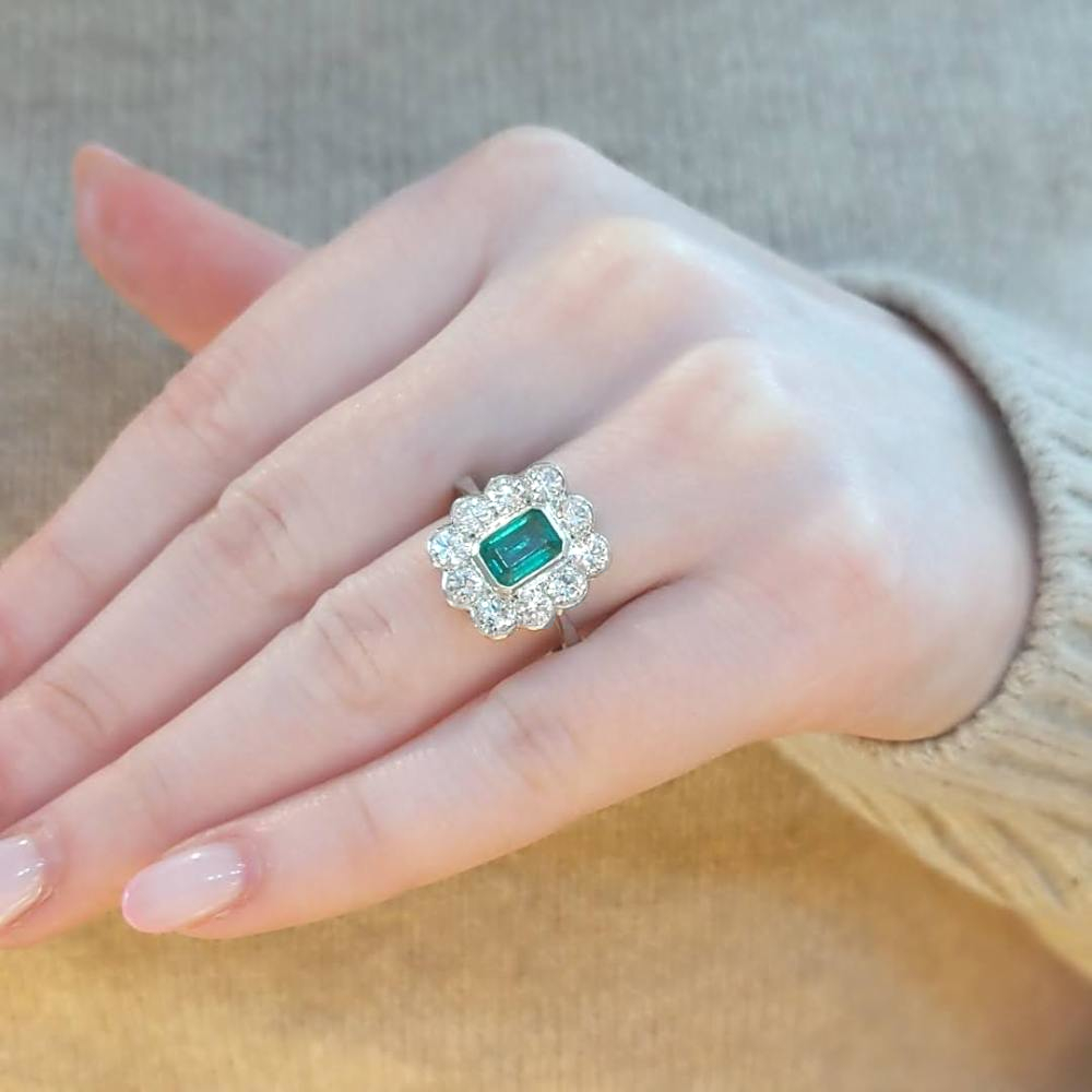 An emerald and diamond cluster ring set in platinum.