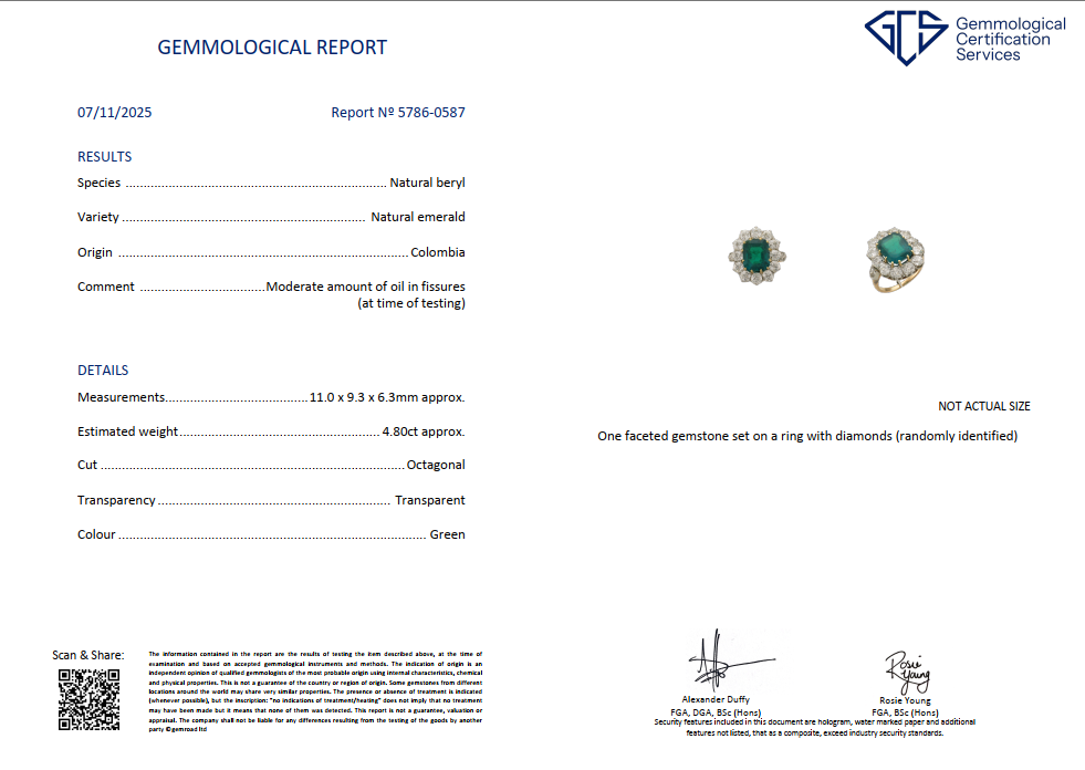 This ring is accompanied by an independent gemmological certification verifying that it is of Colombian origin – renowned for their exceptional colour and quality. For further detail regarding this ring please contact us on (091) 745 505.