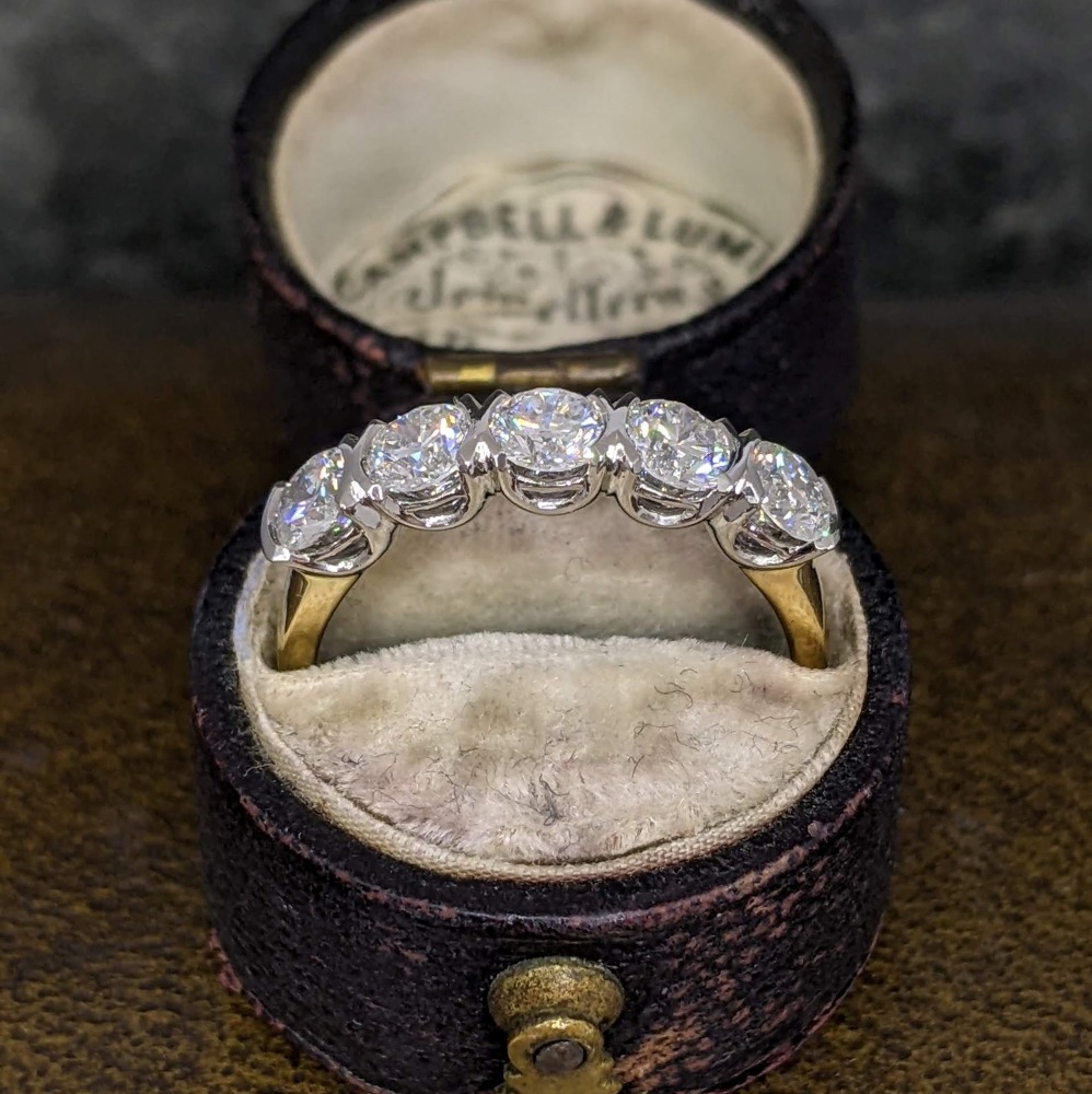 This ring features five round brilliant cut diamonds secured in half collet settings. This curved shape gives a nice silhouette to the diamonds, which are F/G colour, SI clarity and have a combined carat weight of 1.12cts. This is a bright ring which sits very well alongside other rings, or as a stand alone piece.