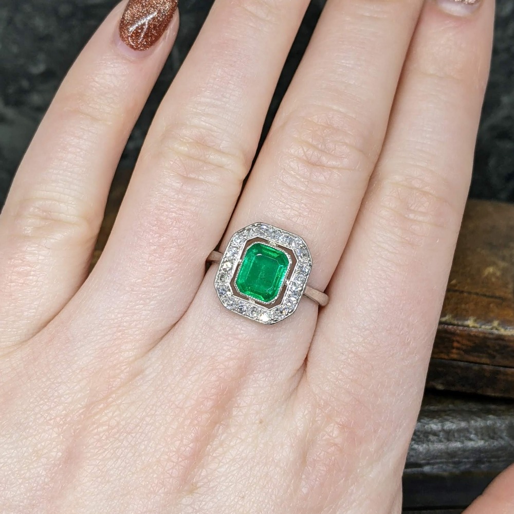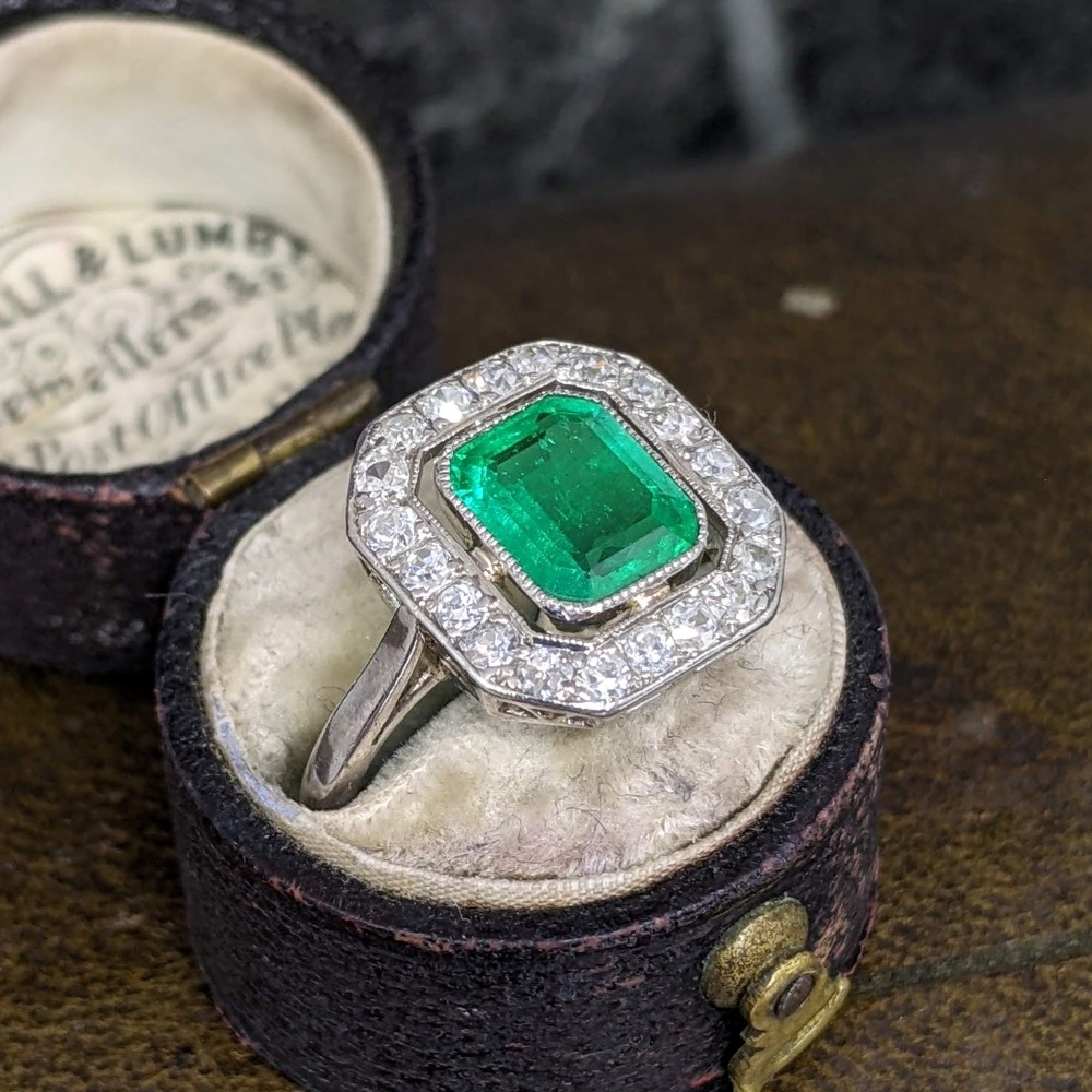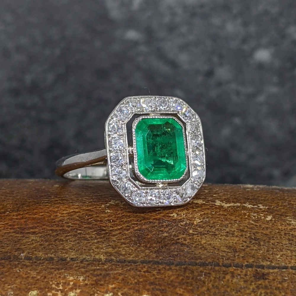 An original antique Art Deco emerald and diamond cluster ring set in platinum.