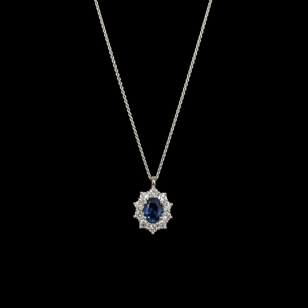This pendant features a stunning oval cut sapphire with a deep blue colour, claw set in 18k white gold. The sapphire is an impressive 1.70cts, and is surrounded by 1.01cts of round brilliant cut diamonds. This is a substantial and eye catching pendant, which looks very impressive while wearing.