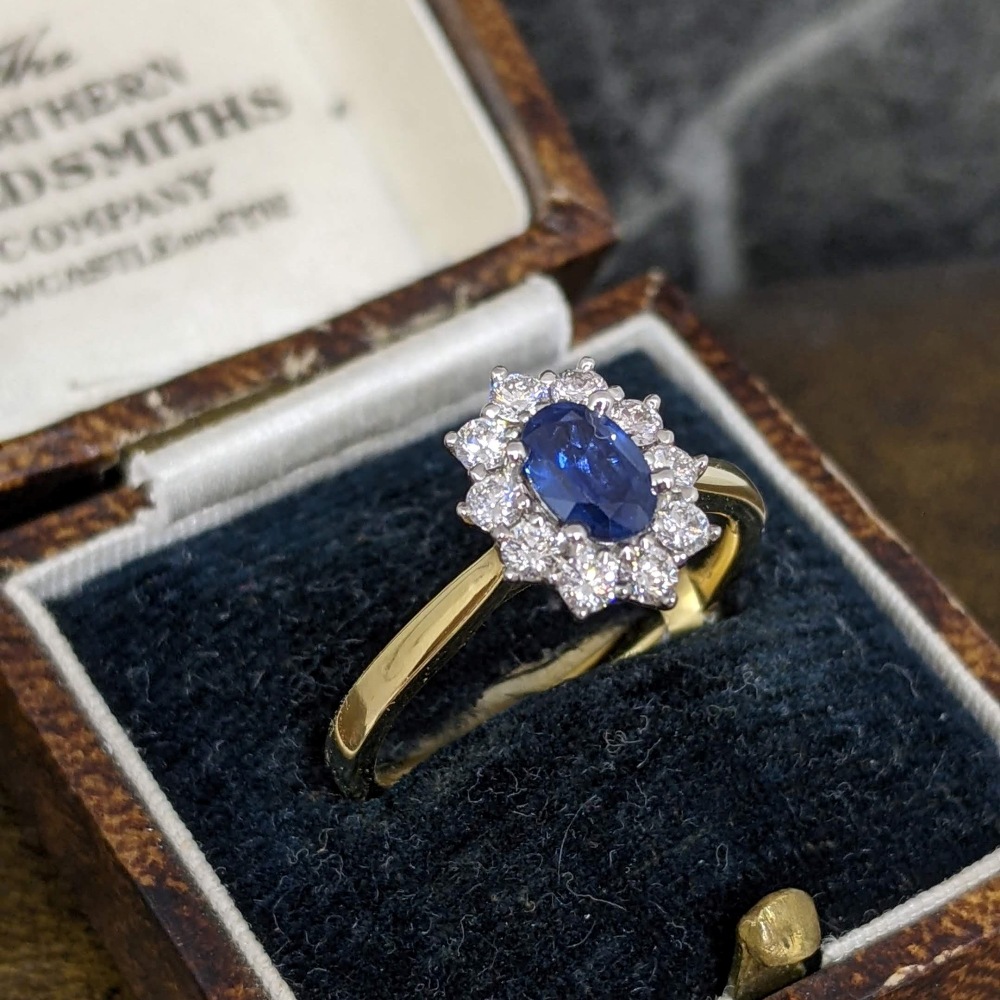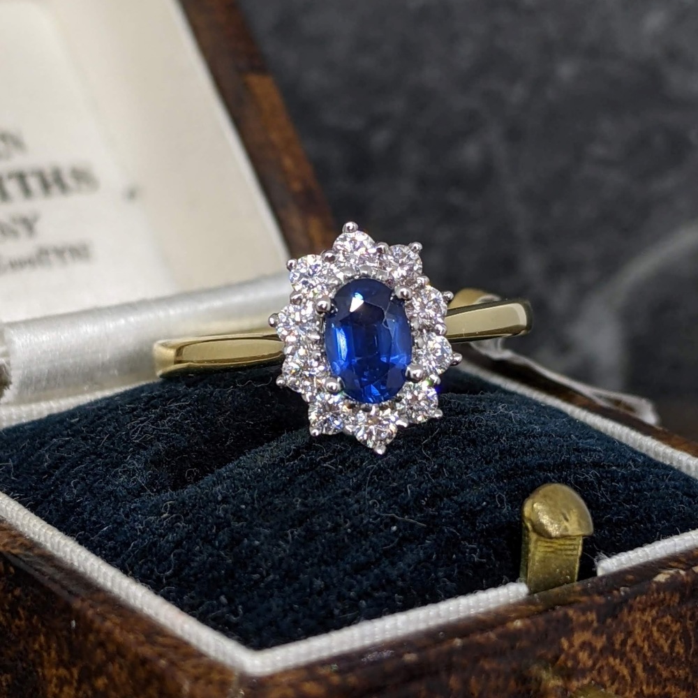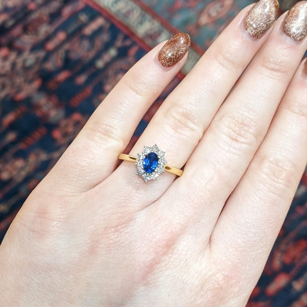 The ring features an oval sapphire with a bright blue colour and a carat weight of 0.62cts. The central sapphire is surrounded by 10 round brilliant cut diamonds, F/G colour with a bright sparkle and a combined carat weight of 0.37cts.