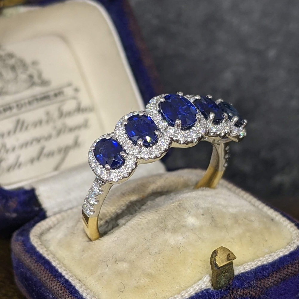 This ring features 5 oval cut sapphires, with a beautiful blue colour. The sapphires are elegantly graduated in size, and are surrounded by a neat row of round brilliant cut diamonds with additional diamonds to the shoulders of the band. The ring has lovely width on the finger, and looks very impressive on the hand. The sapphires and diamonds are secured in platinum and set to an 18k yellow gold band.