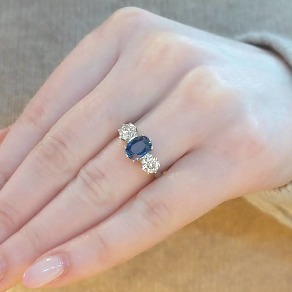 This ring features a 1ct oval cut sapphire claw set in platinum. The sapphire has a rich blue colour, with flashes of a brighter blue throughout. To each side are two bright old European cut diamonds with a stunning old world sparkle, and a combined carat weight of 0.85cts. This is a nicely proportioned ring on the hand which looks very impressive – well worth trying if you have been searching for a beautiful sapphire three stone!