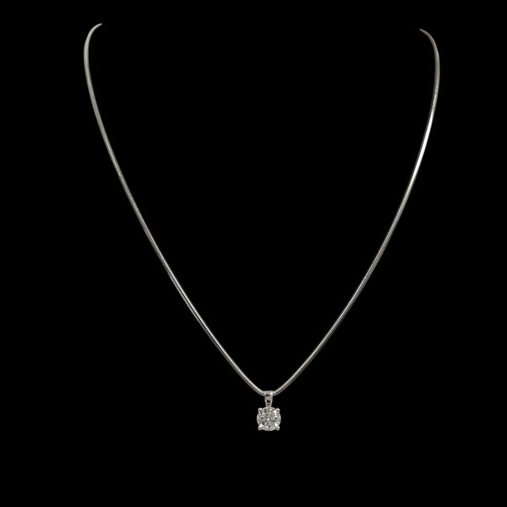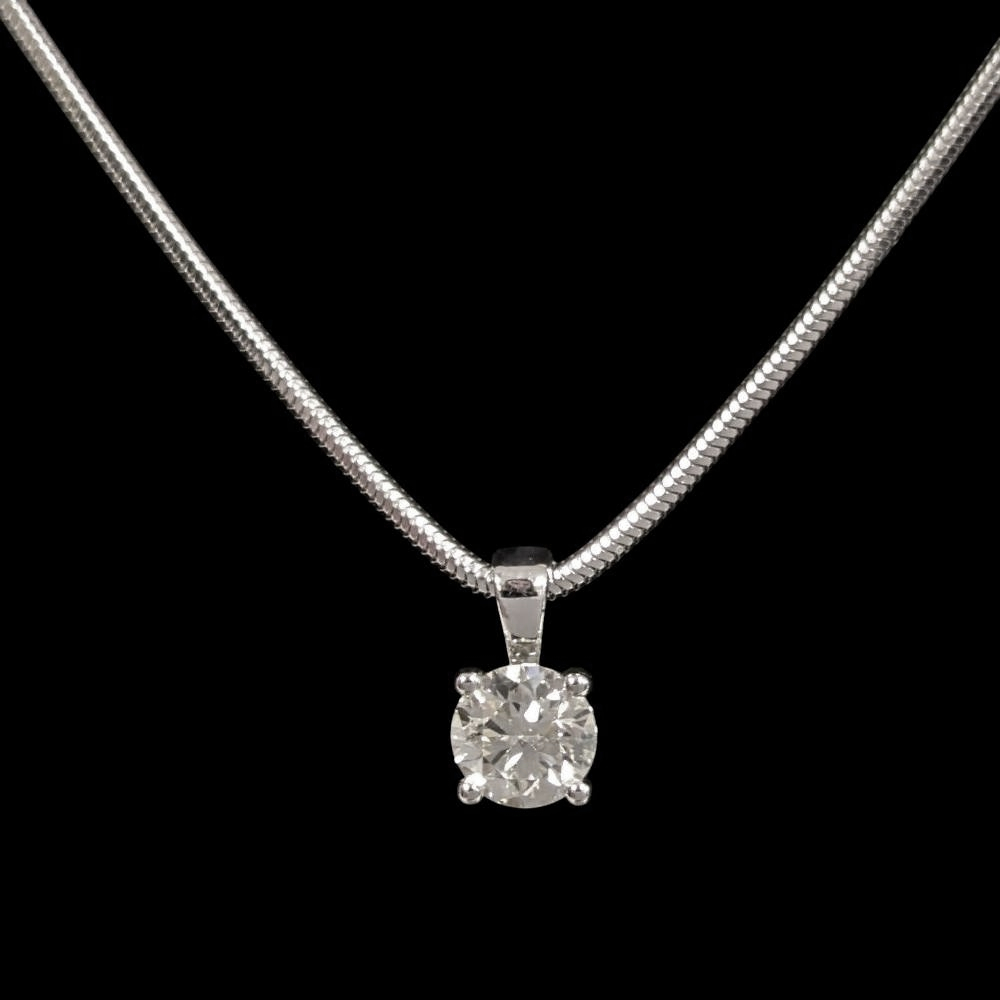 This pendant features a stunning round brilliant cut diamond, secured in a four claw white gold setting. The diamond is very bright, with a carat weight of 1.0cts. The pendant sits on a snake link chain crafted in 18k white gold, which feels beautifully smooth while wearing.