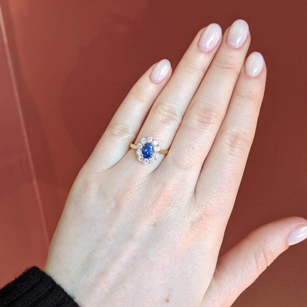 This ring features an oval cut sapphire with a beautiful lively blue colour, secured in a four claw platinum setting with a carat weight of 1.08cts. The sapphire is surrounded by ten round brilliant cut diamonds with a beautiful bright sparkle in a classic cluster style. The diamonds are F/G colour, SI clarity, and have a combined diamond carat weight of 0.69cts.  This ring is a neat size on the hand, and would work very well with alongside a band, or as a stand alone piece.