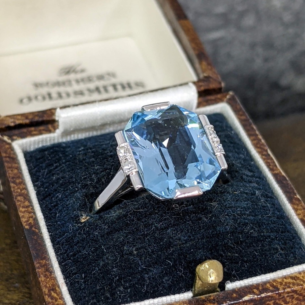 A beautiful vintage aquamarine and diamond ring set in 14k white gold