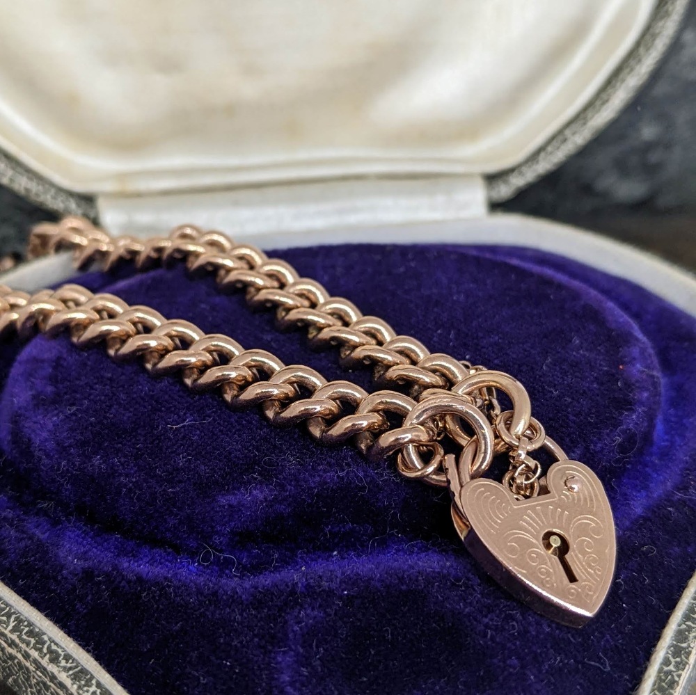 This bracelet has a solid curb pattern, which looks neat on the wrist while feeling substantial. The link measures approximately 6.5mm wide and weighs 24 grams. At 7.75″ in length, this would suit a larger wrist. The bracelet closes with a heart lock, is secured with a safety chain and dates from the 90’s.