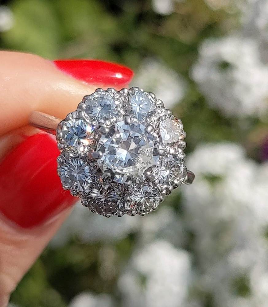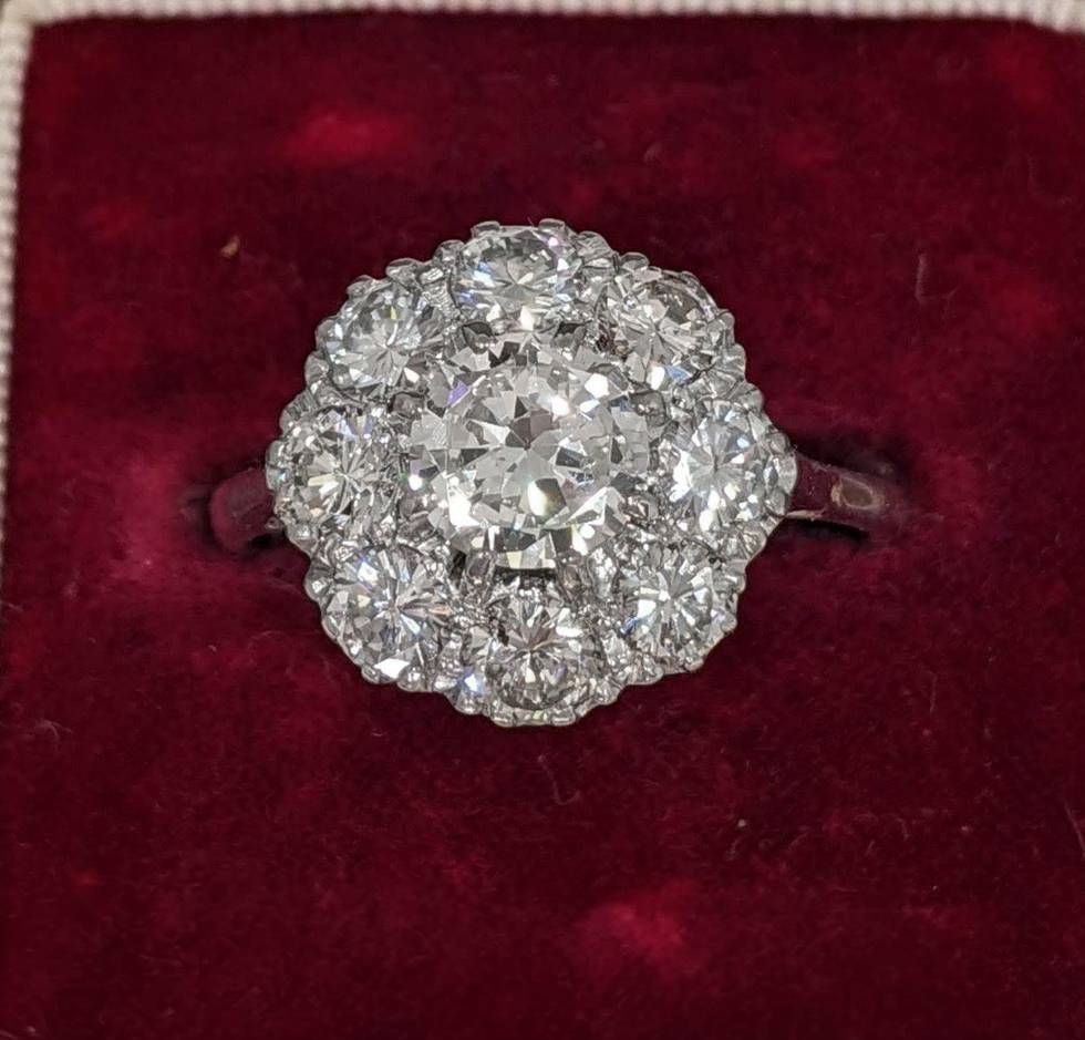 This cluster ring features a large transitional cut diamond to the centre, with a carat weight of 1.07cts! The central diamond is nicely claw set, sitting above the cluster to give nice shape and dimension to this ring on the hand. To the outside are eight additional diamonds, giving this ring a combined diamond carat weight of 2.67cts. This is a nice example of an impressive, vintage cluster, and is sizable on the hand.