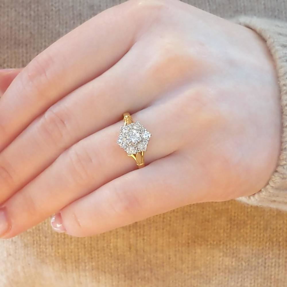 This ring features a central round brilliant cut diamond, surrounded by a further ten diamonds in a cluster style. Set to an 18k yellow gold band with split detail to the shoulders, this has a neat proportion on the hand and is very pretty. The ring has a total diamond carat weight of 0.85cts.
