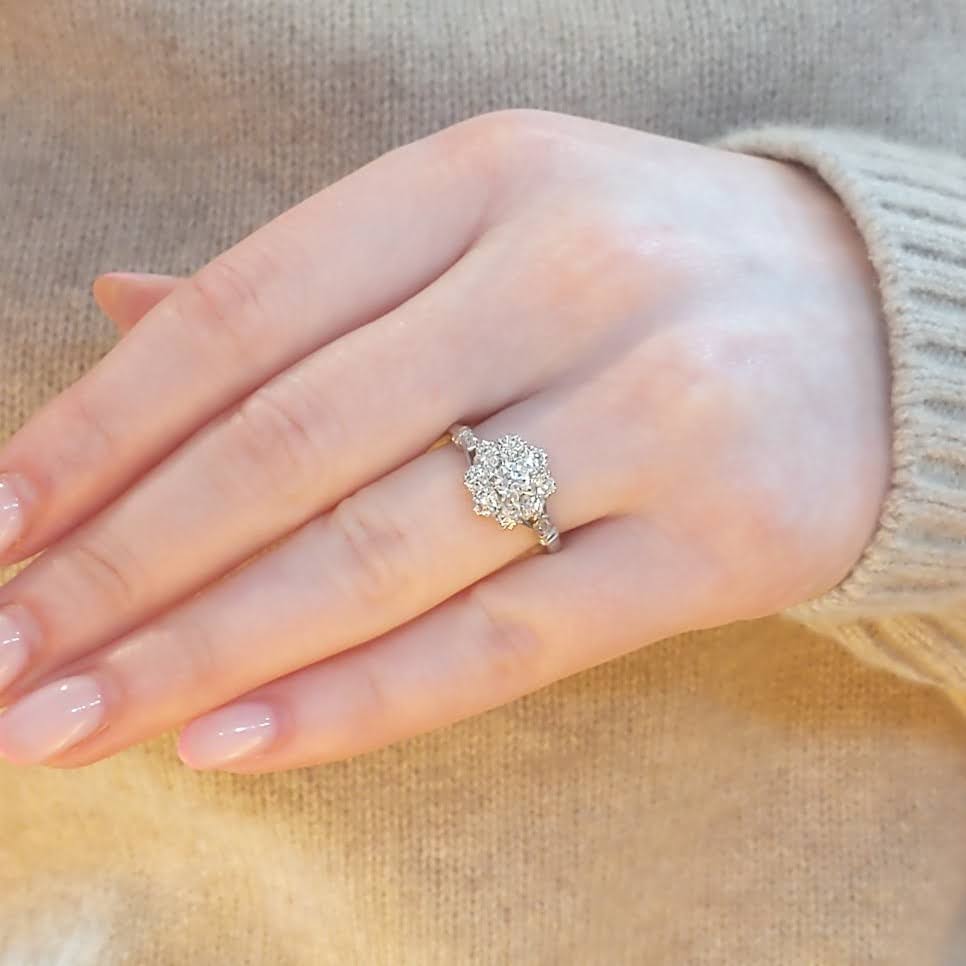 This ring features a central round brilliant cut diamond, surrounded by a further eight diamonds in a cluster style. To the shoulders are very pretty details – a split openwork design to the shoulders, set with a diamond at each side. This is a beautiful and bright cluster ring, nicely proportioned on the hand with a total diamond carat weight of 0.78cts.