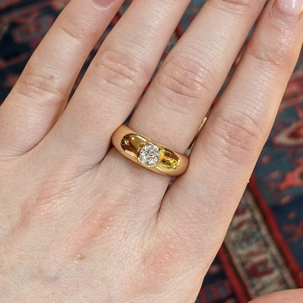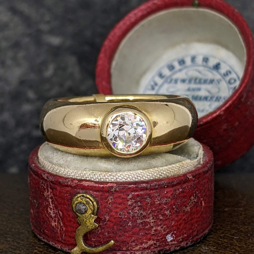 This ring features a central large Old Euro Cut diamond with a stunning sparkle, secured in bezel setting. This ring has a nice chunky band, with a silky and luxurious feeling to the rich yellow gold that curves at each side. The old cut diamond has a total carat weight of 0.6cts, and it is beautifully bright.