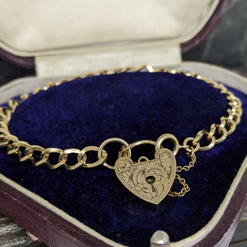 This bracelet has a solid curb pattern with oval links. The link measures approximately 6mm wide and weighs 9.1 grams. At 7.25″ in length, this would suit an average sized wrist. The bracelet closes with a heart lock, is secured with a safety chain and is dual hallmarked for Dublin, Ireland 1971 with the heart lock having a London Hallmark for 1970. At the time it was not unusual for Irish made pieces of jewellery to have clasps imported from specialists UK supplier.