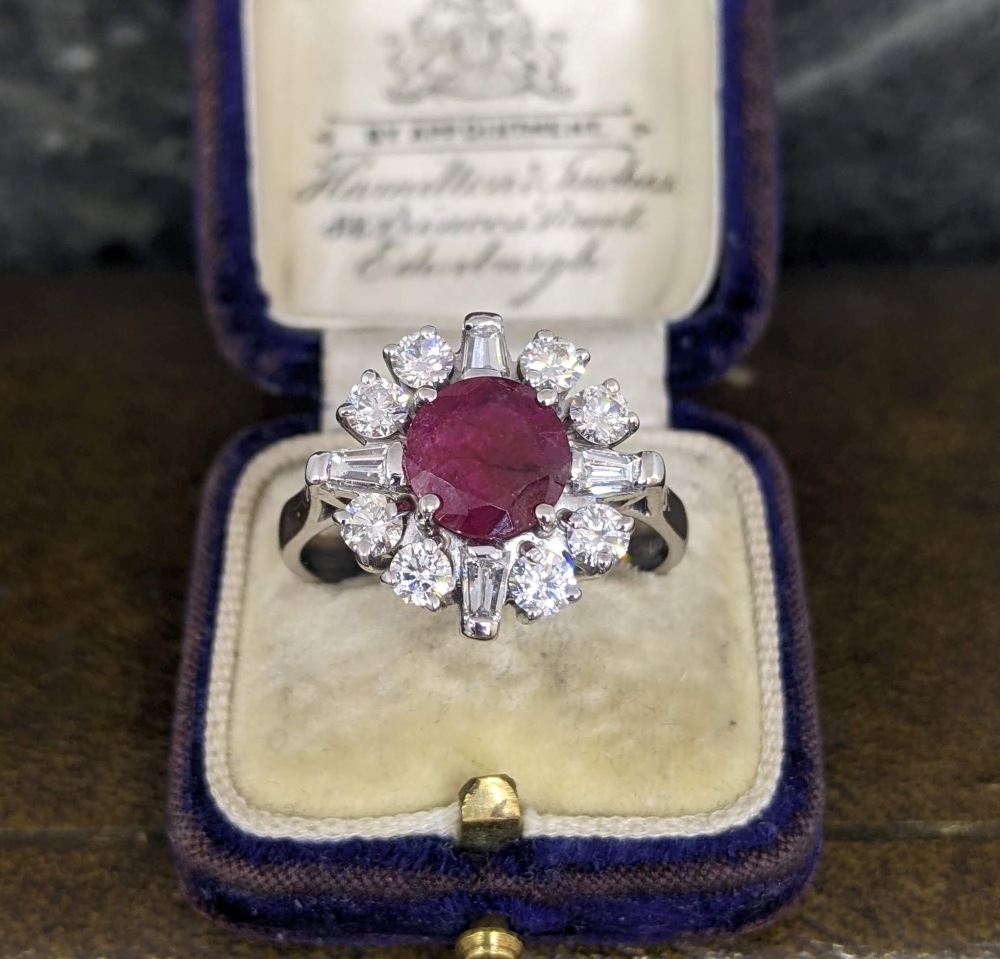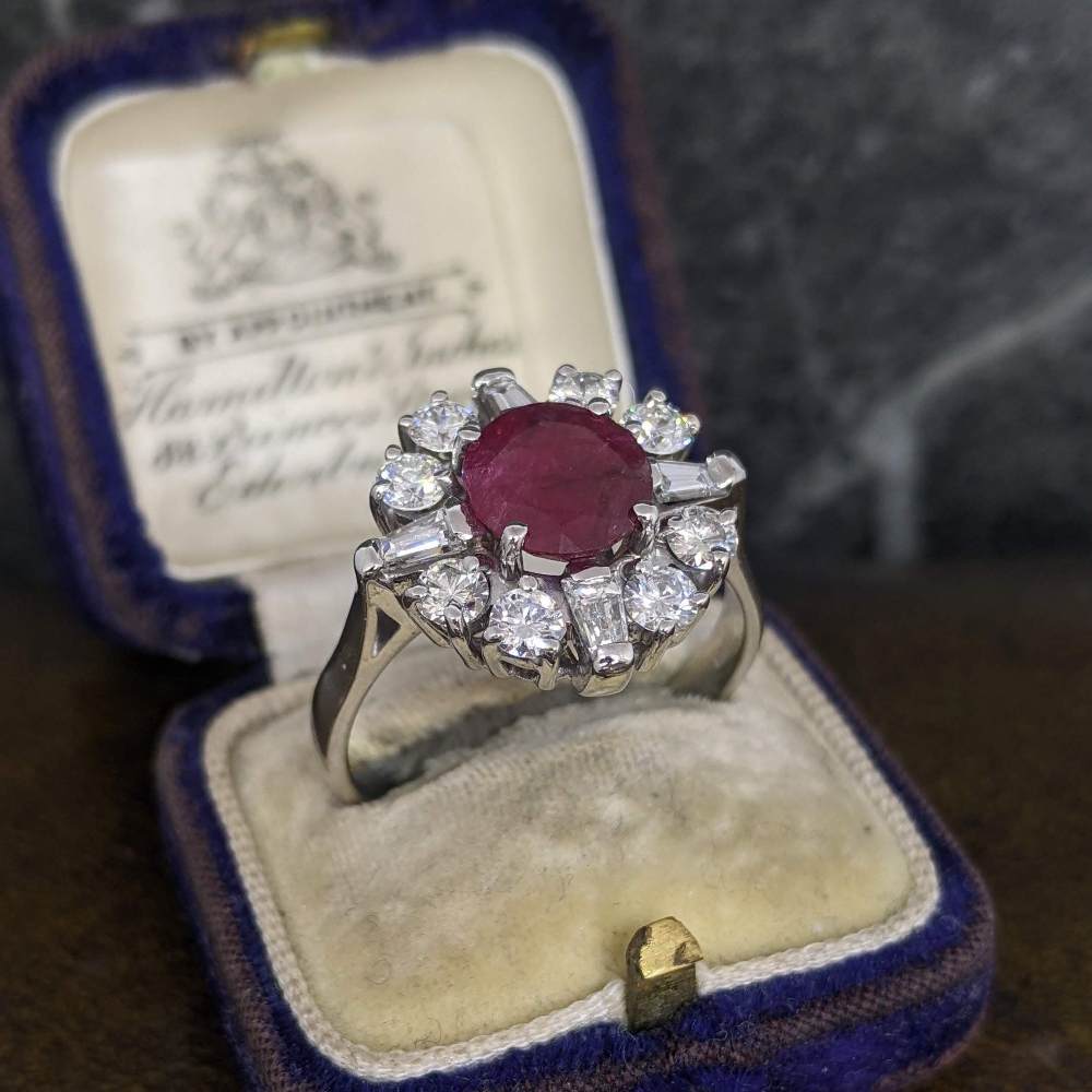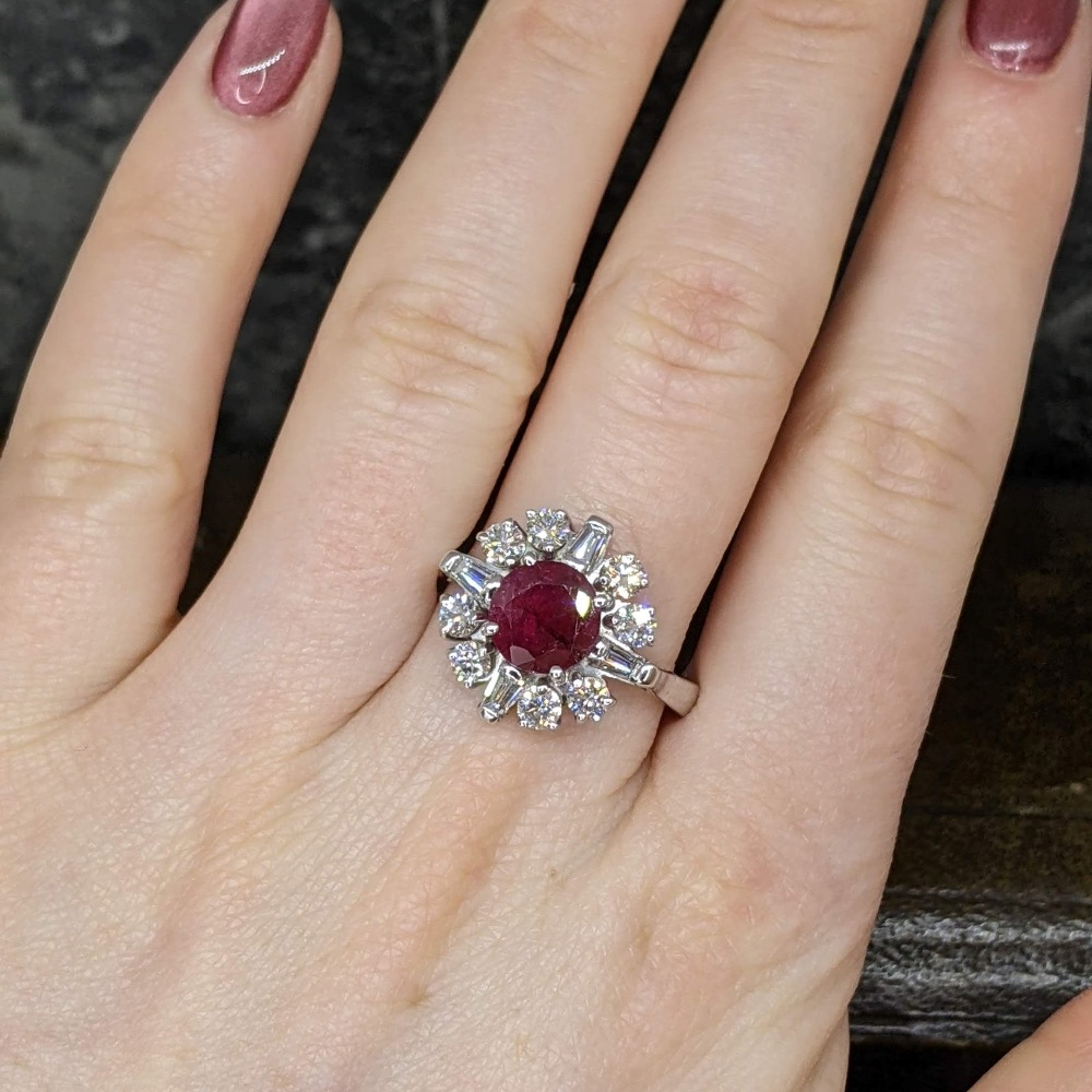 This ruby cluster ring has a striking and unusual design, set with round brilliant cut diamonds and tapered baguette diamonds between. The ruby is round with a deep red colour, secured in a four claw setting. The diamonds are lovely and bright, with nice contrast in shape and colour which gives great spread across the finger. This is a sizeable and impressive ring on the hand, sitting close to the finger for comfortable wear. This piece has a ruby carat weight of 1.7cts and a total diamond carat weight of 1.25cts.