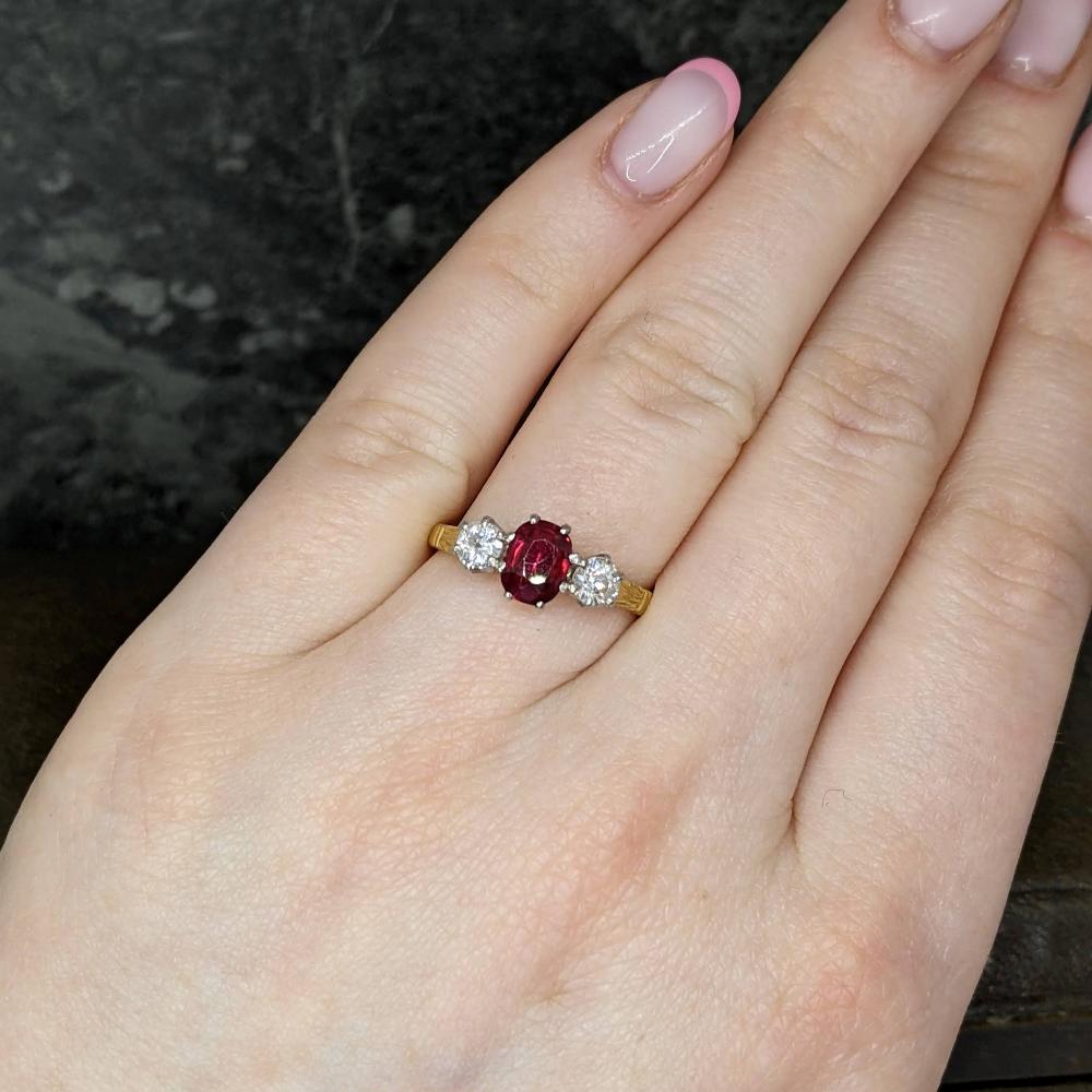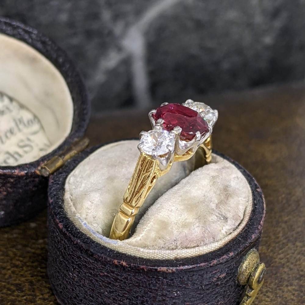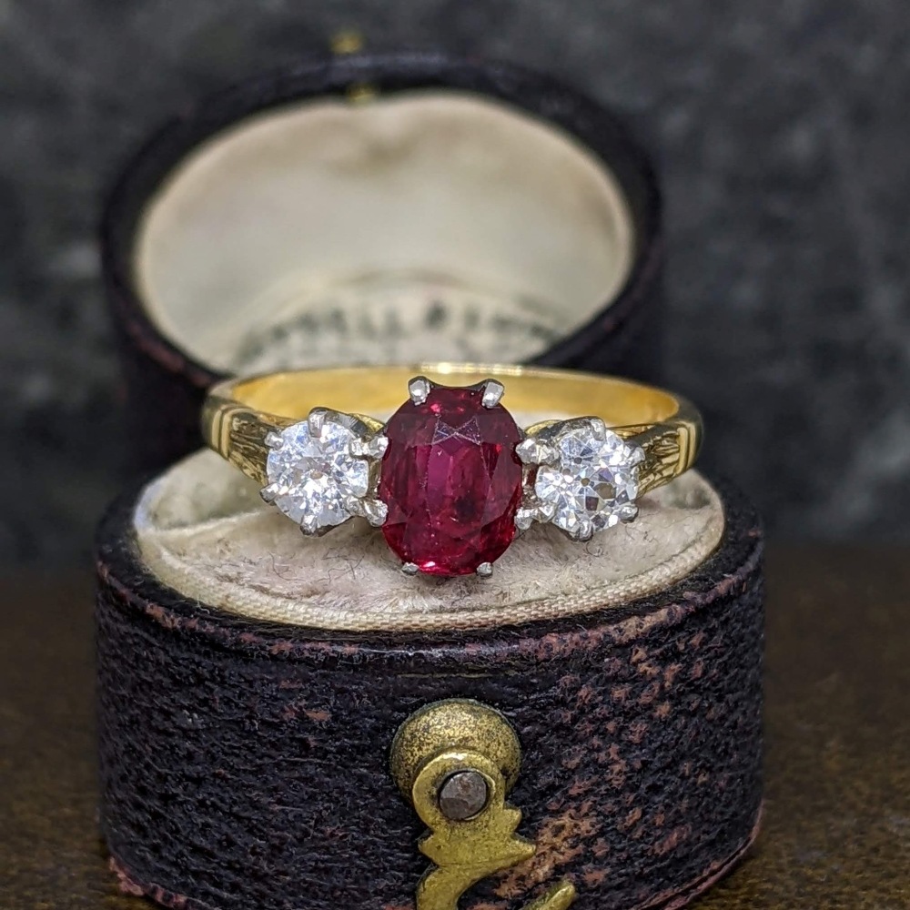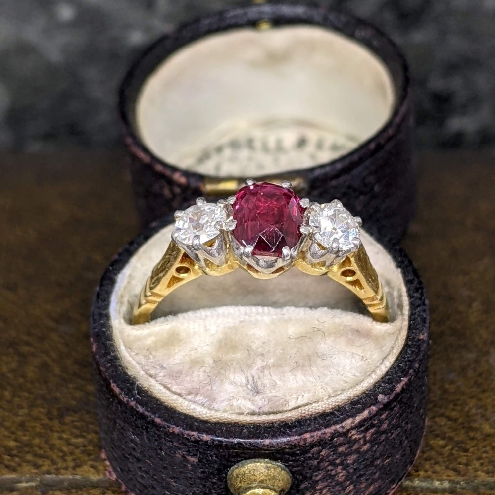 A vintage ruby and diamond trilogy ring set in 18k yellow gold and platinum.