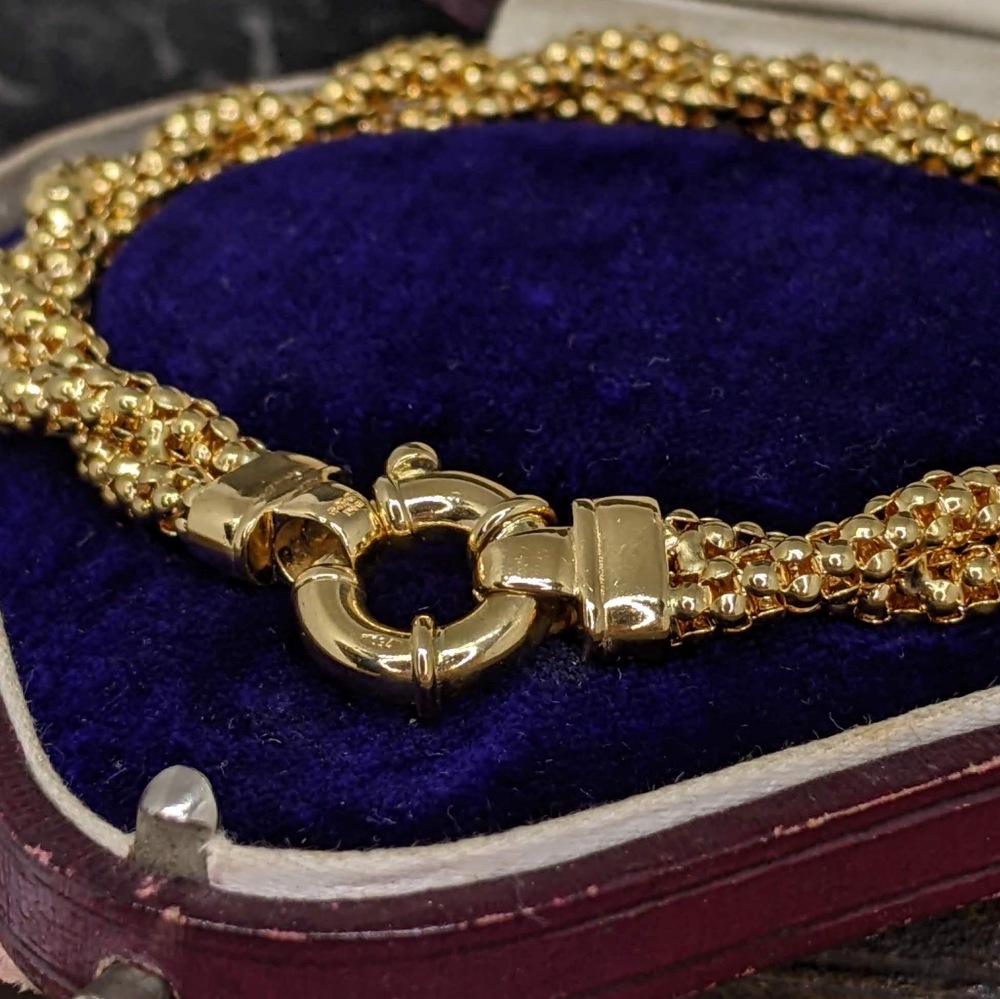 This bracelet has a really unusual link, which is comprised of two curving strands intertwined together, all crafted in 18k gold. The curve of this bracelet sits very comfortably on the wrist, with each curved link catching the light beautifully. The bracelet closes with a a stylish nautical clasp which feels and secure.