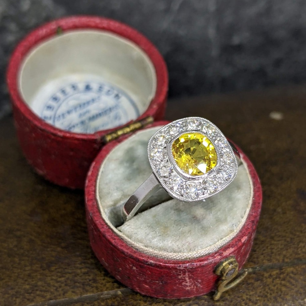A beautiful yellow sapphire and diamond ring set in platinum.
