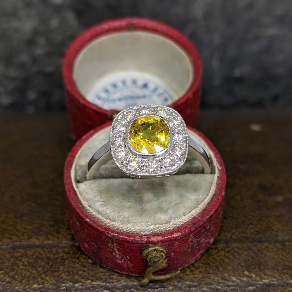 The cushion cut yellow sapphire has a beautiful depth of colour, which contrasts beautifully against the bright diamonds surrounding it. The sapphire is bezel set in platinum and has a carat weight of 1.3cts. The ring features round brilliant cut diamonds with milgrain detailing to the outer edge for a combined carat weight of 0.40cts.